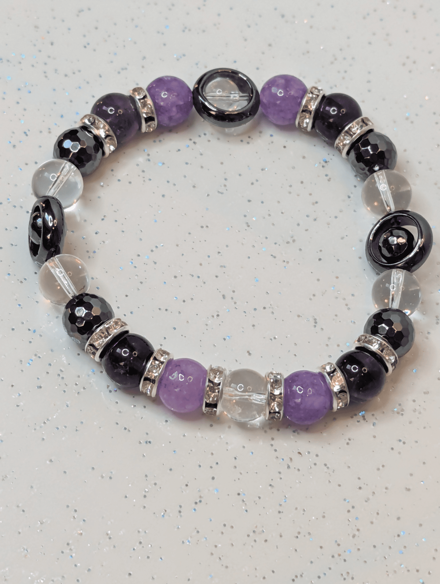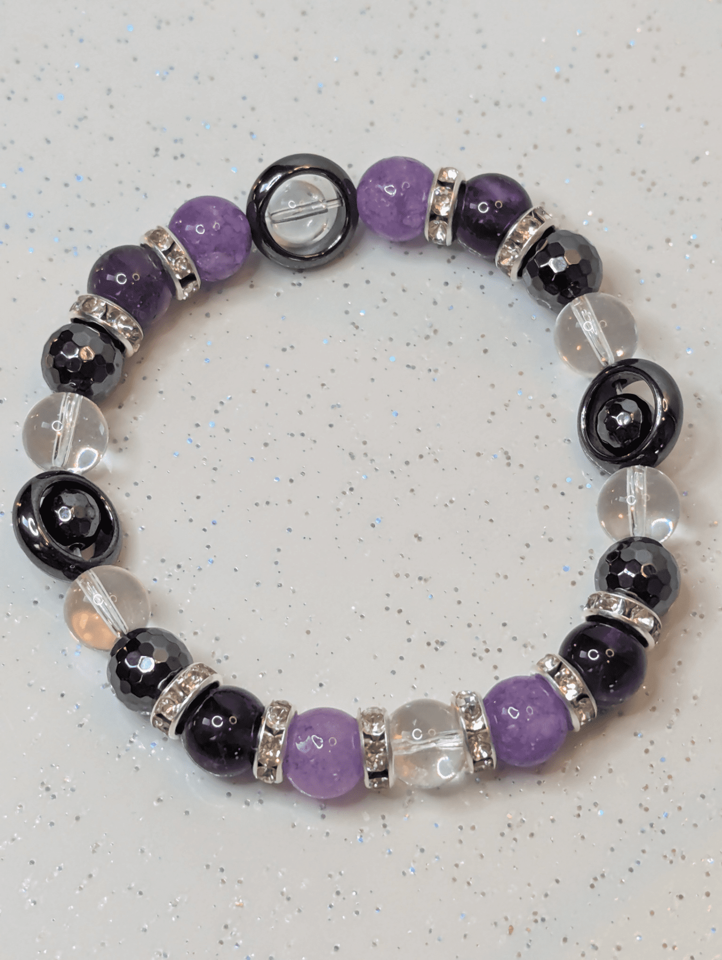 Le modèle Abby est constitué d'Améthyste, de Cristal de roche et d'hématite. Ces pierres sont dotées de vertus luttant contre les addictions et les excès.
