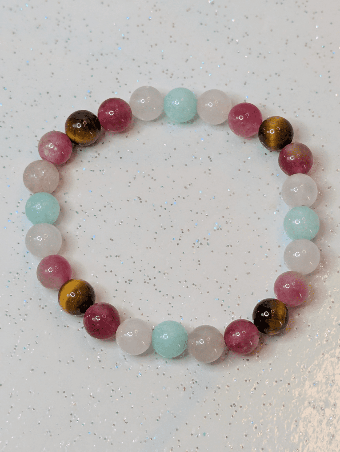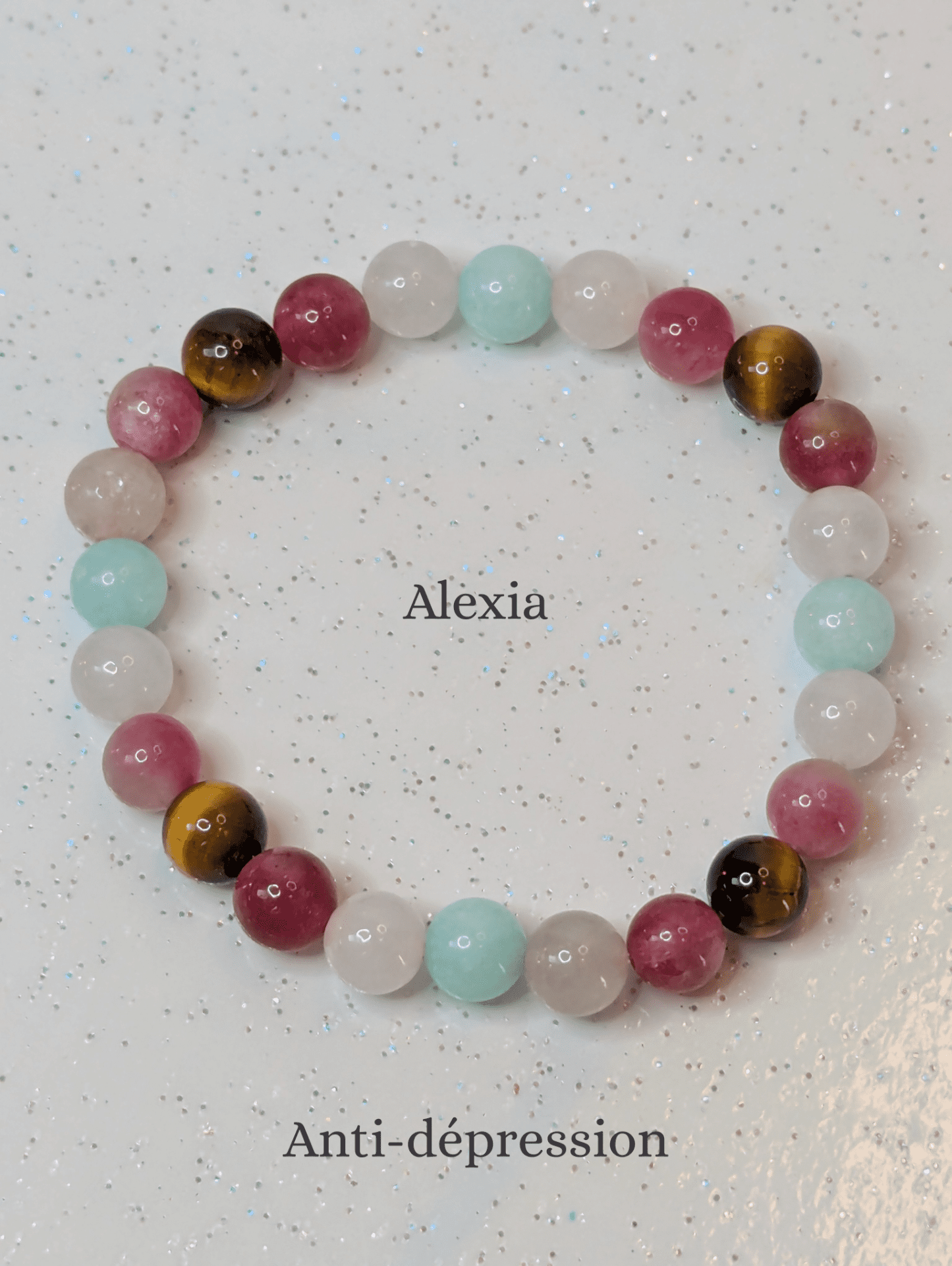 Le modèle Alexia est constitué de Quartz rose, d'Amazonite, Tourmaline Pastèque et d'œil de tigre. Ces pierres sont dotées de vertus luttant contre la dépression et la mélancolie.